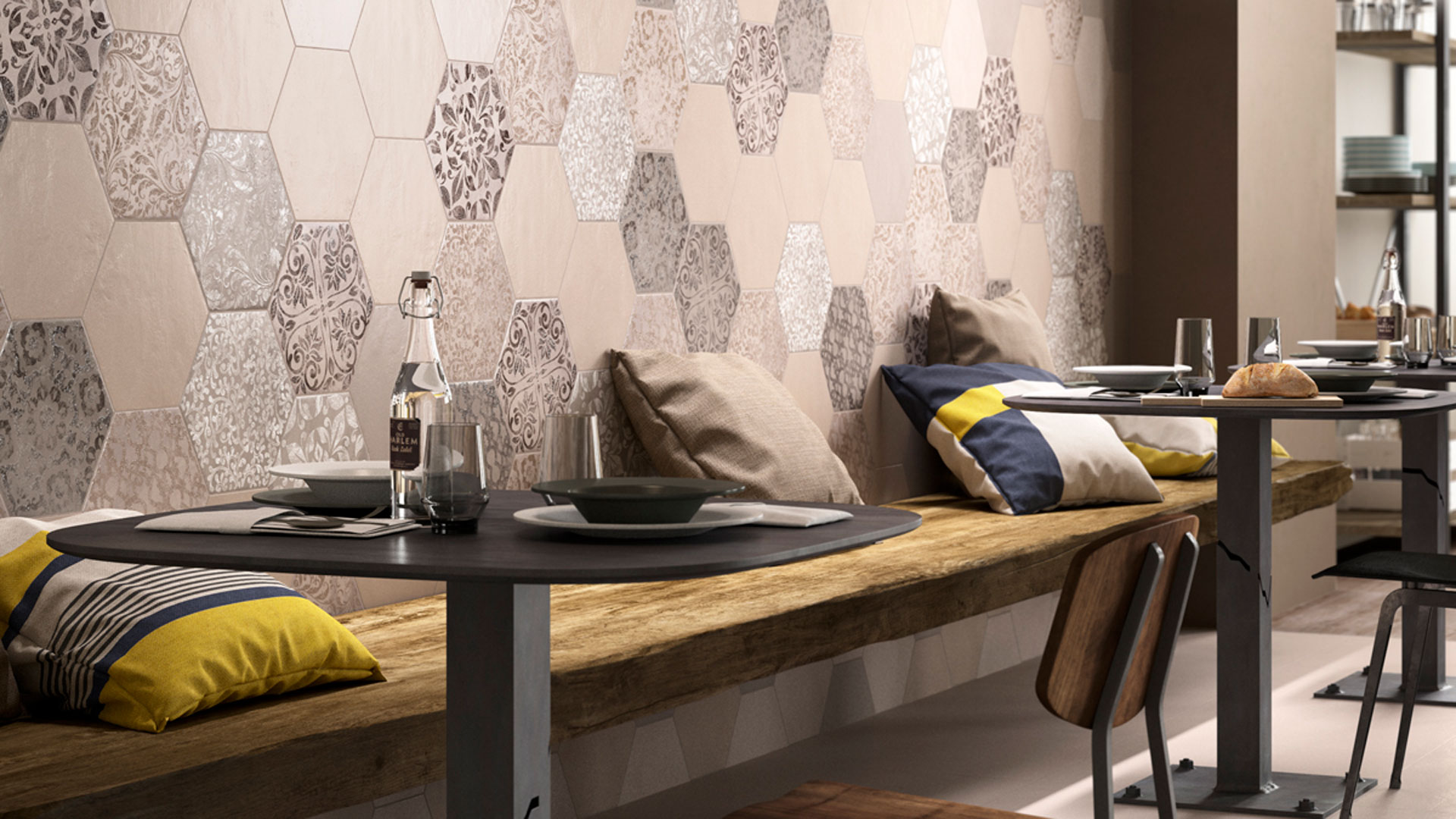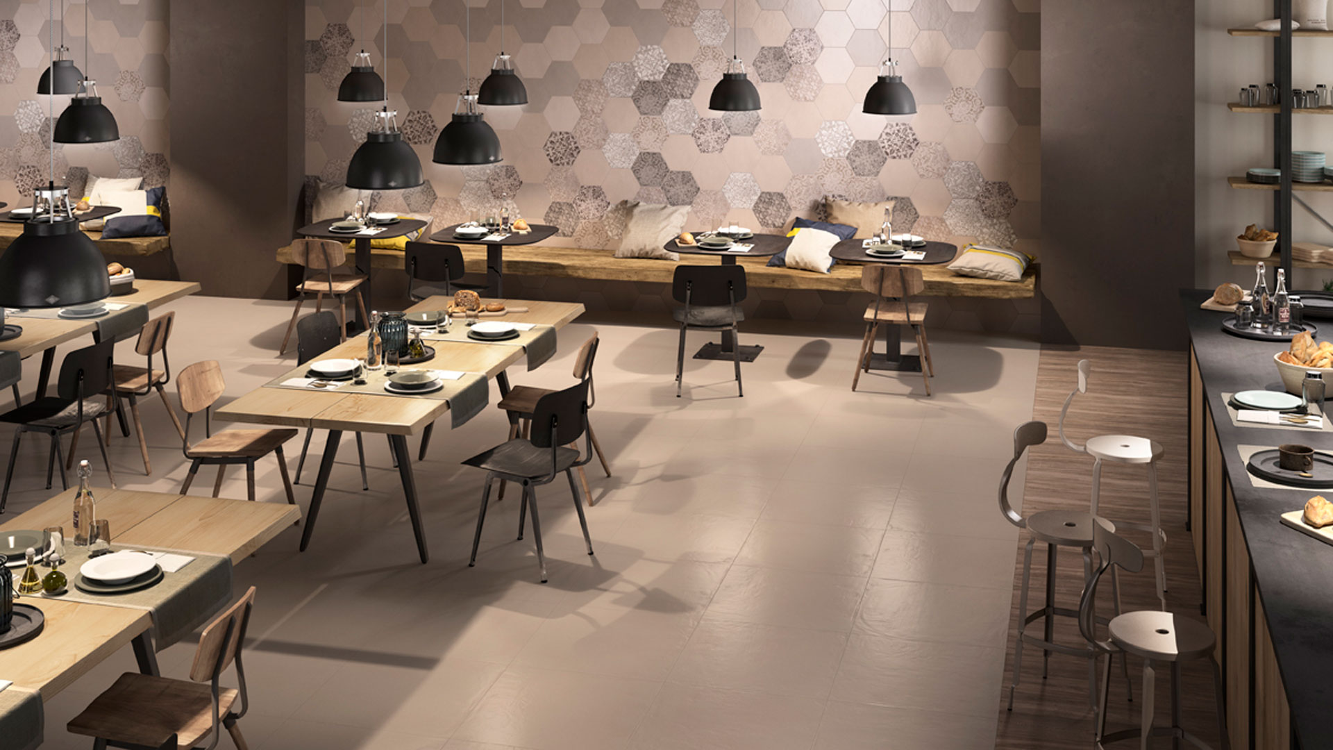 As opposed to an industrial cementitious floor concept, poured concrete in its liquid state may be mixed with epoxy resin components to provide a seamless, uniform, crack free look, therefore achieving a slick and modern look in larger floors. Process allows the installer to create patterns or finish it with a trowel, which mimics the handcrafted touch. Bodega successfully incorporates this design concept, adding value with hassle free installation and a great budget.